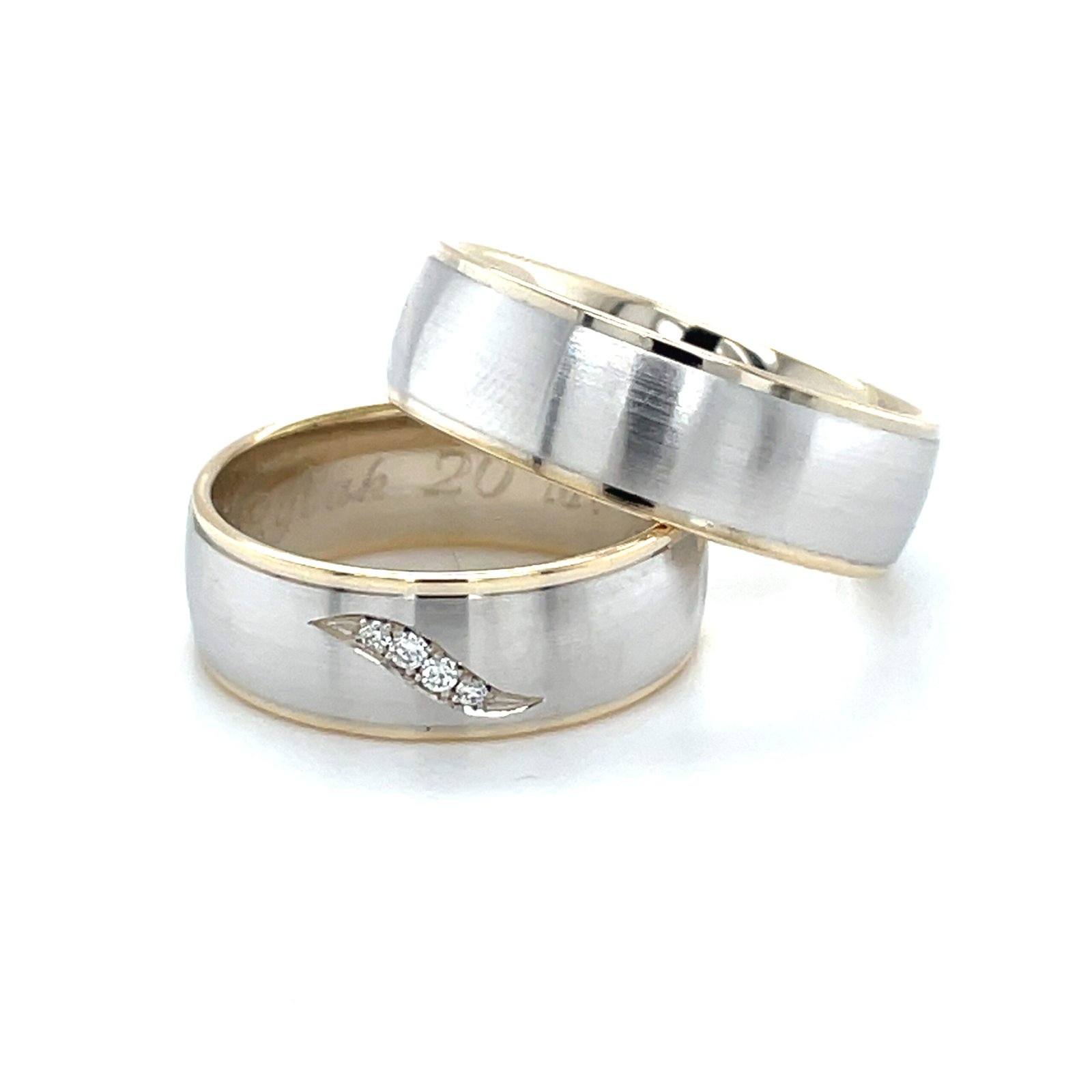 Obrączki ślubne Whisper Line – złote obrączki z białym wykończeniem i brylantami | Pracownia grawersko-złotnicza Katowice