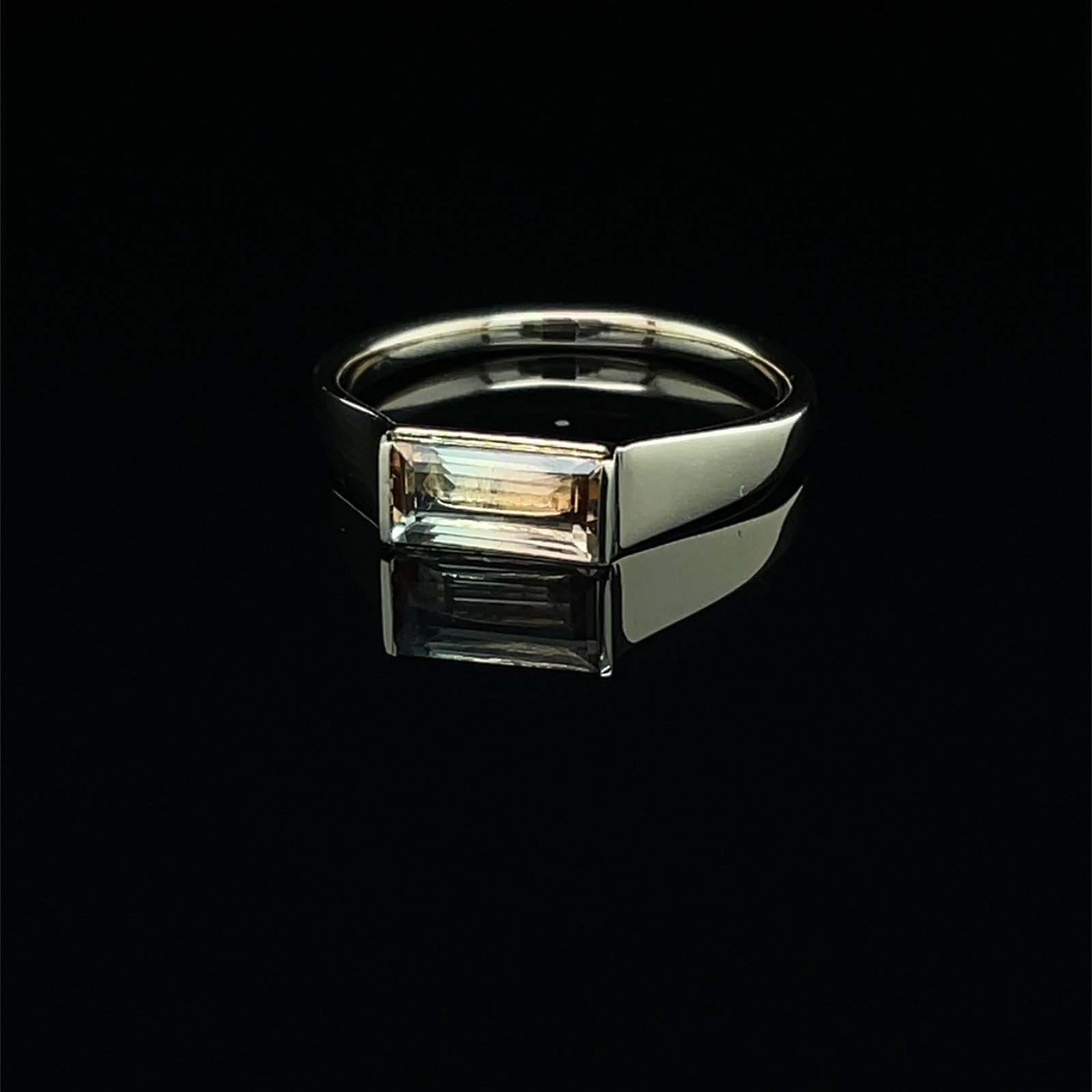 Pierścionek Clarity Axis to manifest minimalizmu i nowoczesnej elegancji. Wykonany ze złota 14k (próba 585), wyróżnia się geometryczną formą i oszczędnym designem, w którym główną rolę gra prostokątny kamień w szlifie baguette. Subtelne refleksy światła przechodzące przez jego wnętrze nadają biżuterii spokojną, architektoniczną harmonię.