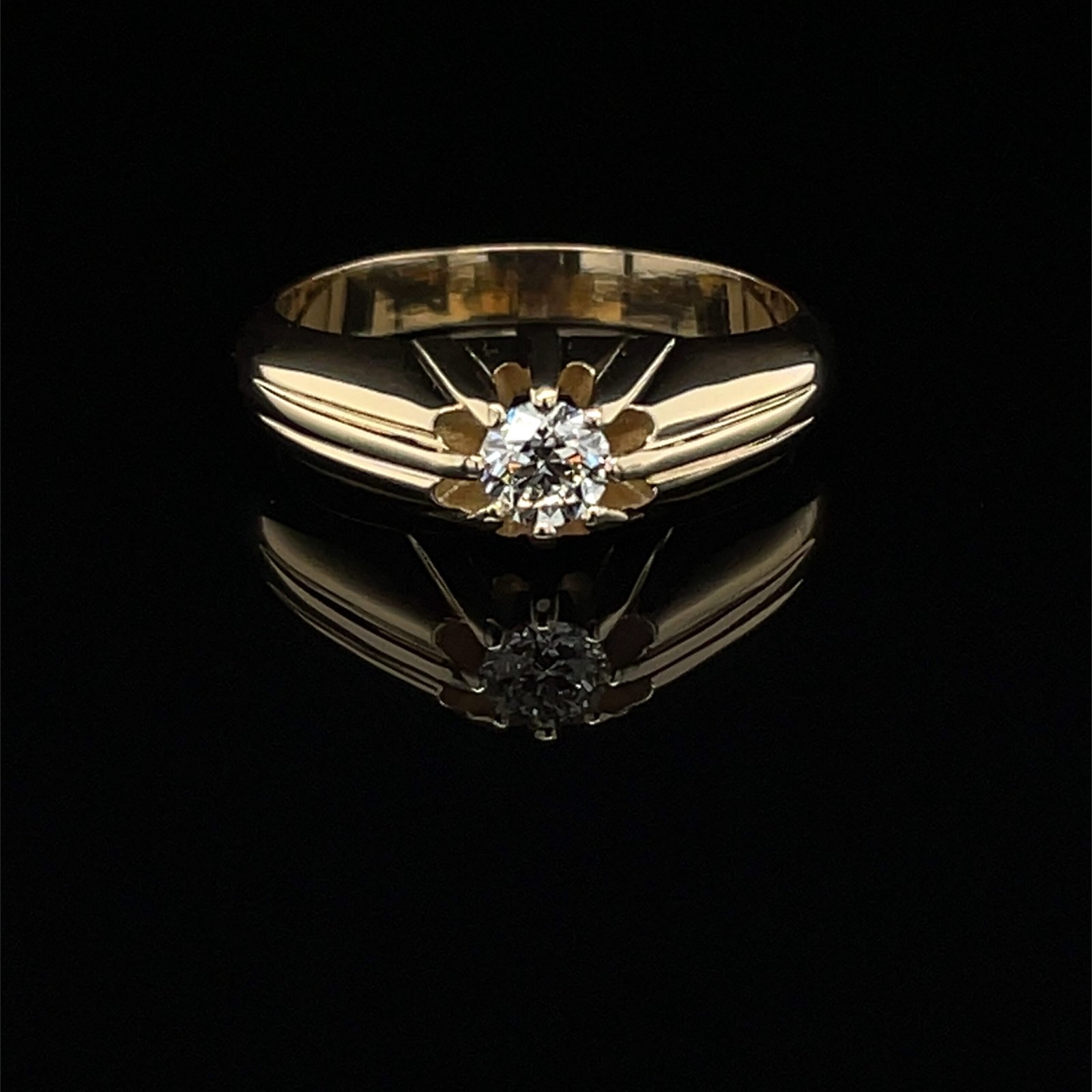 Pierścionek Golden Flare wykonany ze złota 14k zachwyca klasycznym kształtem i centralnym brylantem. Tworzony na zamówienie w pracowni jubilerskiej w Katowicach, z możliwością dopasowania koloru złota i parametrów kamienia. Idealny jako biżuteria codzienna lub pierścionek zaręczynowy.
