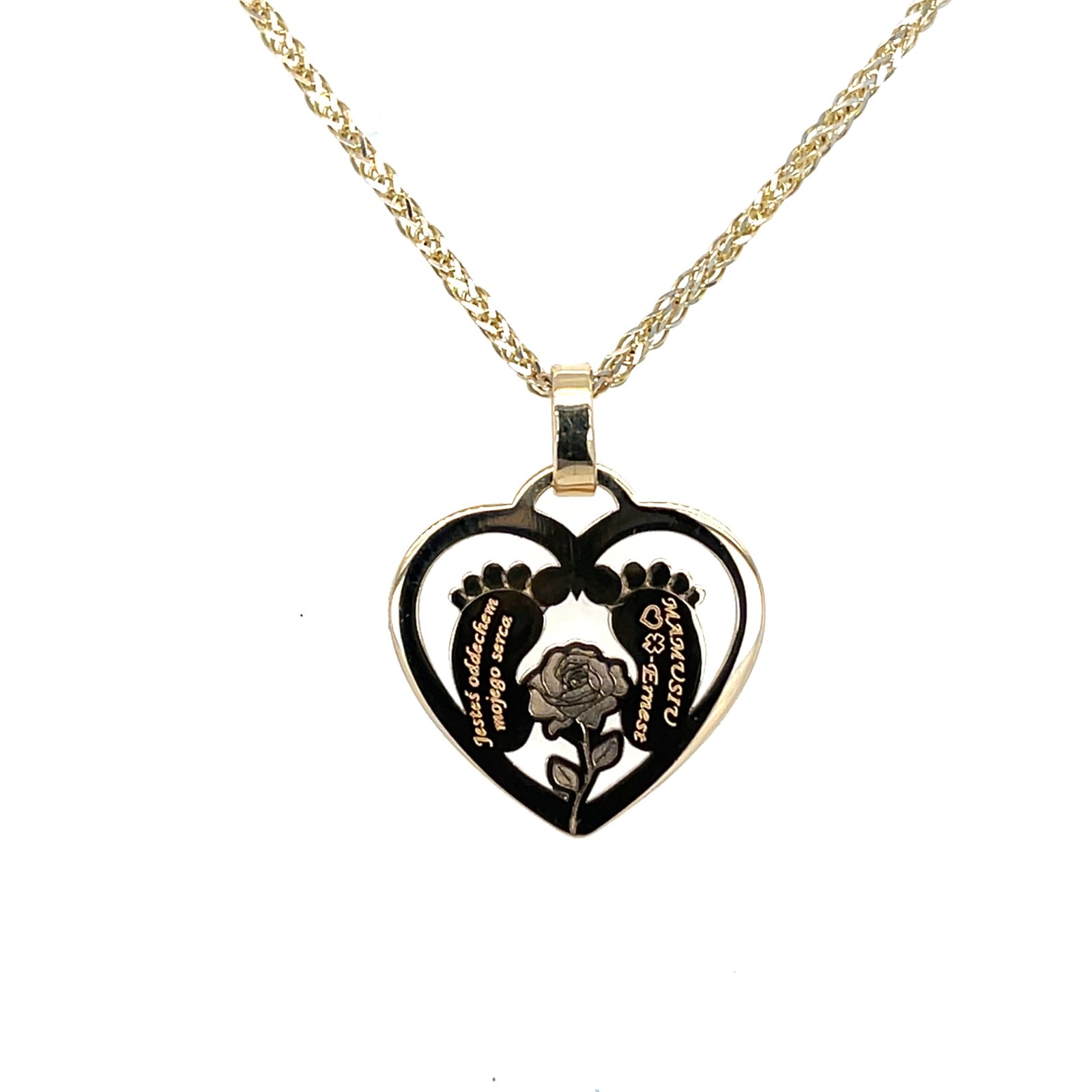 Złota zawieszka Heart Imprint w kształcie serca ze stópkami i motywem róży to biżuteria o symbolicznym charakterze. Wykonywana na zamówienie w Katowicach, może być spersonalizowana poprzez grawer z imieniem lub dedykacją.