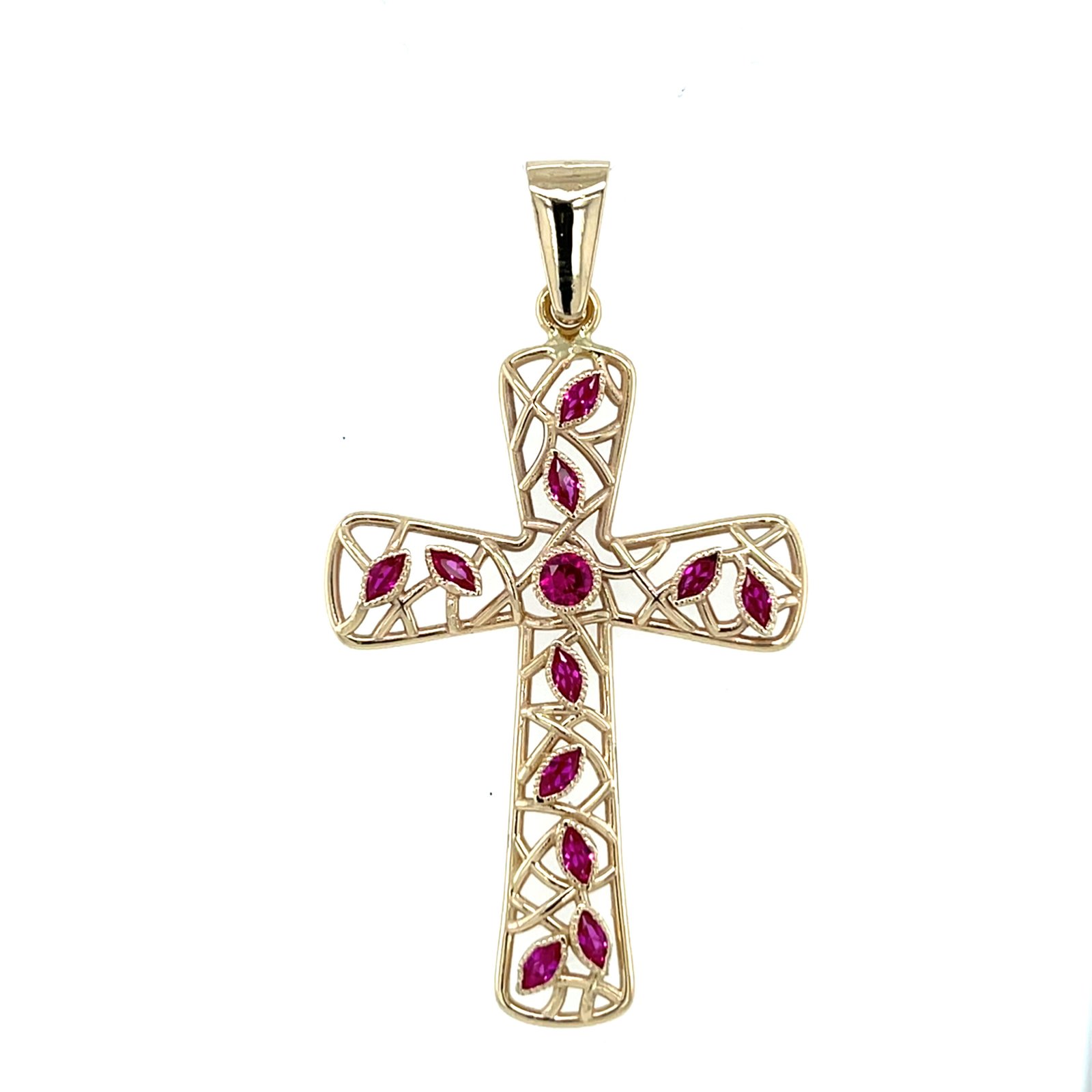 Ruby Bloom to zawieszka, w której klasyczna forma krzyża zyskuje nowoczesną lekkość. Wykonana ze złota 14k (próba 585), zachwyca ażurową konstrukcją przypominającą misterny splot gałązek. W jej strukturze osadzono intensywnie czerwone rubiny, układające się w subtelny, kwiatowy rytm.
